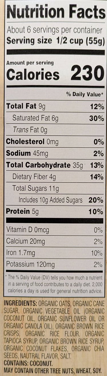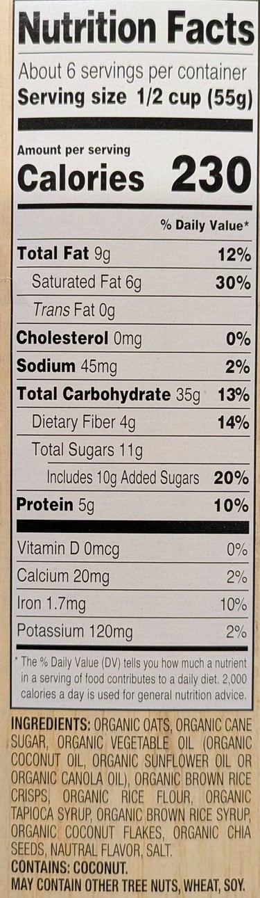 The ingredients are listed under the nutrition data. Ingredients are listed in order by weight, in decreasing order. So, by weight, this food has the highest weight of organic oats, then cane sugar, then oil, and so on. This section is important from the perspective of getting a variety of food ingredients in your diet. In many highly processed foods (no matter the variety of flavor and texture), the first few ingredients are the same across many foods, so you can trick yourself into thinking you're eating a wide variety of foods when you're really eating just 3 or 4 main ingredients all the time, prepared in many different ways.
